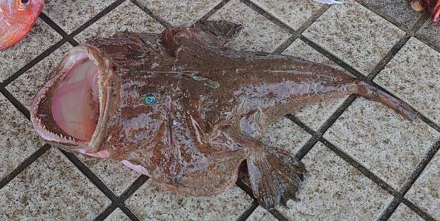 体長1m前後になる。全体に褐色で頭が大きく、皮はぶよぶよしている。水深30〜500mに棲む。 口の上にある棘の先端に、ひらひらした皮弁(布状のもの)がついていて、エサのように動かして、小魚を誘い、近づいてきたら食べる。