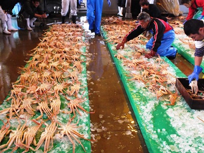 他方、香住や津居山漁港では大型の漁船を持ち、3日程かけて漁をして水揚げしますので、最初に獲れたカニは、どうしても肉質が落ちてしまいます。とは言うものの、輸入物とは比較にならないほど人気があり、最近では各漁港ごとに色分けをしたり、船の名前を入れたタグを付けるなどブランド化に取り組まれています。