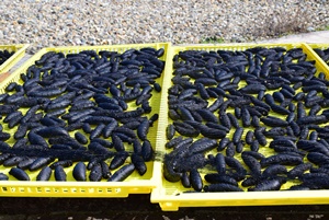 ナマコは丹後では主に小型底引網漁で漁獲されます。主に生鮮で出荷されますが、近年は煮干(イリコ)に加工して中華料理の食材として輸出されることが急増しています。中国では元々高級食材として非常に重要な物で、近年の高度成長でグルメブームもあり需要が伸びているようです。丹後では冬は沖に出られず、漁の乏しい時期も手伝ってナマコ漁は増えています。