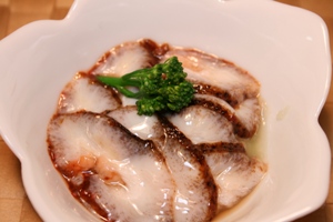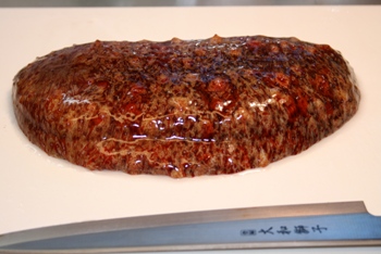 軽く冷水で洗い、口とお尻を切り落とします。次におなかを開いて中の腸を出します。塩をまぶして軽くヌメリを取って洗えば、後は薄切りするだけで完成です。ナマコは熱を通すと柔らかくなりますが、私はコチコチの生の硬さよりも少し柔らかめが好きで、ヌメリを取った物を少し湯に通して氷水で冷ましてから薄切りにします。そうする事で程よい硬さが得られ絶妙な歯ごたえとなるのですが、その為には絶妙な湯加減も必要になります。