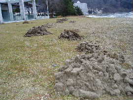 | ←この写真は何だと思われますか? 昨日まで無かったのに、一夜にしてこの 土の山。子供のいたずらかと思いました が、実はモグラの仕業だったのです。 今年は雪こそ少ないですが、週末は波 が高く、釣りに出られる方も無く、サッパ リなので、釣り情報ならぬ、モグラ被害 情報でした。 |