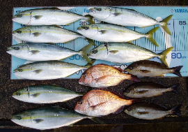 メーター級のブリやヒラマサが釣れてい るとの情報で調査に行きました。アジを 泳がせて釣れたのは75cmのヒラマサ でした。 |