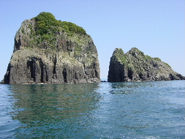 船釣りをしない方はご存知無いかも知れ ませんが、マリントピアからは1つに見え る冠島の小島(沓島)は、実は2つに分 かれているんですよ。 |
