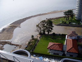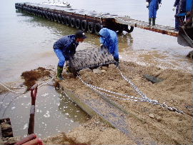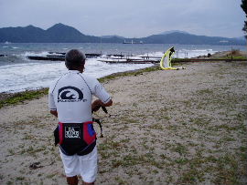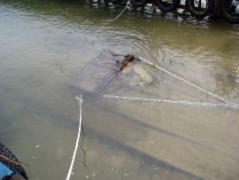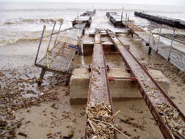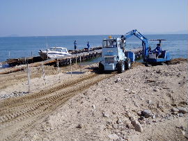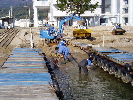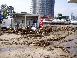 | 上の写真のとおり、桟橋すぐ横まで世屋川からの土砂が迫ってきました。懸命の 撤去作業をしていますが、海底まで広がった土砂は相当量あり、揚降レールだけ 掘っても波ですぐ埋まるのが現状です。 |