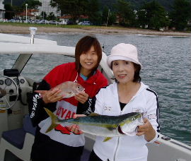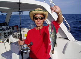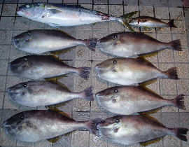 | そろそろジギングで爆釣の時期です。去年10月28日のハマチ入れ食いが忘 れられず、調査に行きましたが空振り、漁礁でメジロ70cmと巨大サンキュウフグ 1匹でした。まだまだエサ釣りの方が硬いようです。 |