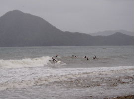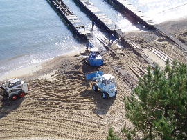 | 10月29日、土砂撤去作業の結果小型揚降レールは何とか使用可能になりまし た。但し、波が来ればまた埋まりますので、その日の状況により揚降禁止とさせて 頂きます。大型揚降レール側は海中部分にまだ大量のゴロ石もあり、波打ち際も 砂が寄せて来ますので、まだ揚降出来ません。来週中には揚降出来るように努力 しています。いましばらくお待ち下さい。 |