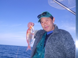前回釣れない人の汚名を着せられた男が、美味しそうなアマダイを見て、エサ釣りに変更か、巻き巻きに徹するか、心が揺れ動いています。