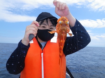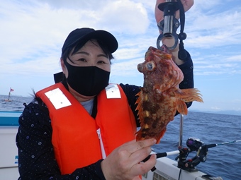 橋本船長も遊んでる。 私はエソの切り身をエサに、ウッカリカサゴを取り込み直前、他の鈎にシイラが掛かり、ラインごと切られて持って行かれました。(-_-;) |