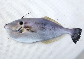橋本船長、童心に返り、小っちゃな鈎でエサ釣りするも、上手にエサを取られ、ウスバハギに遊ばれ放しです。 |