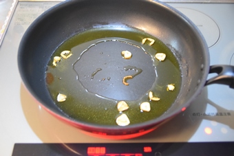 オリーブオイルにニンニクを入れ、弱火でじっくりと香りを付けます。 |