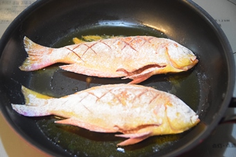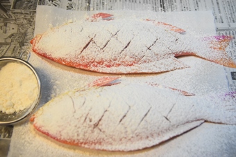 魚の両面に小麦粉を振ります。 |