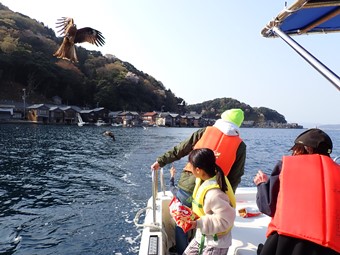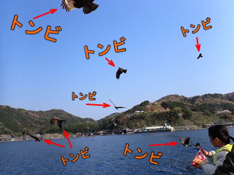 トンビの空中キャッチは大迫力です。 |