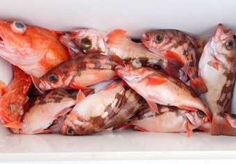 こちらは料理屋さんの水槽用に生け簀で生かしていたユメカサゴです。 ユメカサゴは浮袋が無いためか、深い底から釣り揚げても元気に生きています。 |