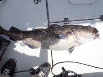 オーナーにお借りしたリールで、何とかタラ釣れました。申し訳なさそうな顔してますが、これ地顔です。 |