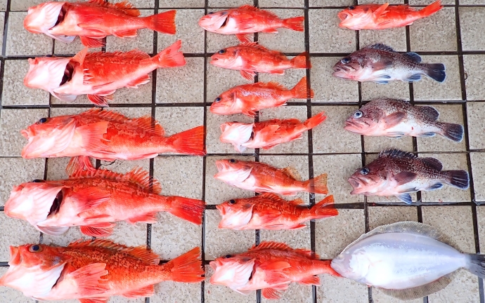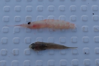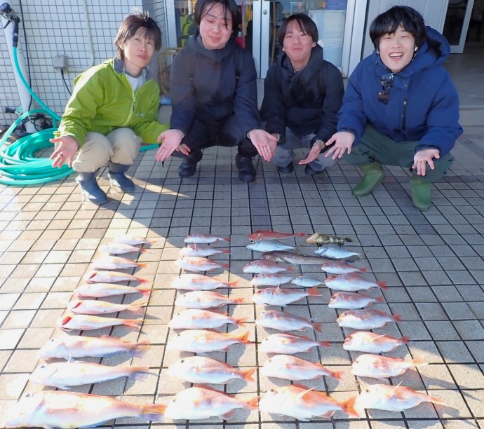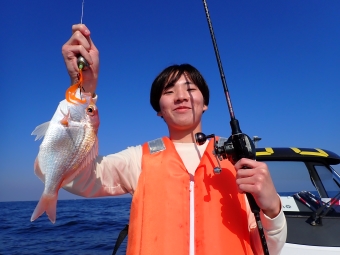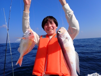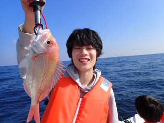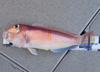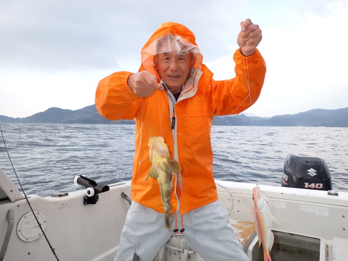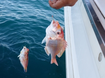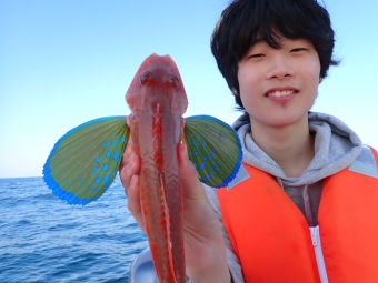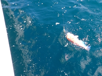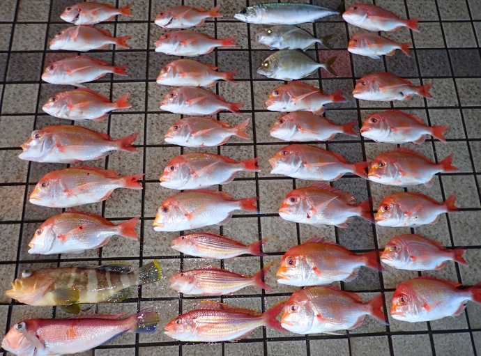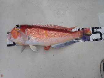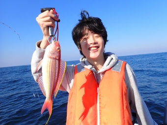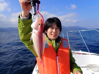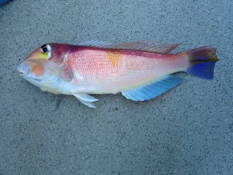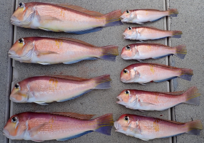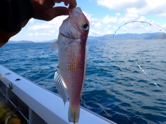 アマダイの口からメゴチの稚魚が出てきました。60mの、こんな深い所にメゴチいるんですね~(@_@) |