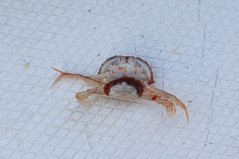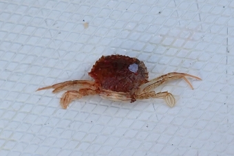2cm程の小さなカニですが、卵を抱えていたので逃がしてやりました。 と言っても、死んでいたような(-_-;) |