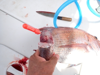 ![]() 簡単な方法は尾びれを切り、脊髄の上の穴から入れると上手くいきます |