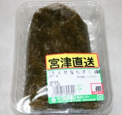 5月中旬になると、湾内のホンダワラが生えた藻場の上で、モズク採りをする漁師さんの姿をよく見かけますが、この頃になると地元産の天然モズクをスーパーでも見かけるようになります。