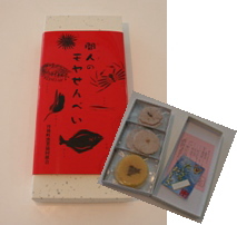 丹後・間人の底曳き網漁業女性の会の会員が、間人の魚介類のおいしさを知ってもらおうと開発したせんべいです。このせんべいは先日東京で開かれた「全国青年・女性漁業者交流大会」の研究・実績活動の報告で、京都府代表として参加して水産庁長官賞を受賞しています。