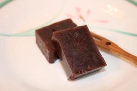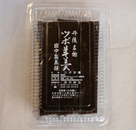 丹後には至る所の和菓子屋で丁稚(でっち)羊羹と呼ばれる羊羹がそれぞれの呼び名で売られていますが、今回ご紹介する田中製菓の「ツボ羊羹」は、その中でもお勧めの一品です。