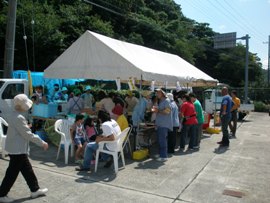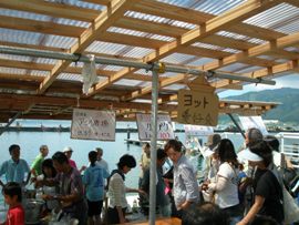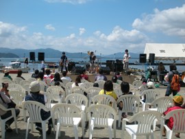 | 9月6日(日)、マリントピアの対岸、田井宮津ヨットハーバー海の駅で「宮津湾にぎわいフェスタ2009」がおこなわれました。マリントピアからボートで行くと僅5分程度ですが、車で回ると約50分かかります。当日は江尻桟橋と宮津丹海汽船桟橋からの送迎便が出ていましたので、それを利用された方が多かったようです。 |