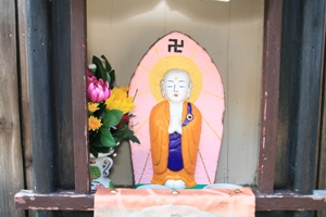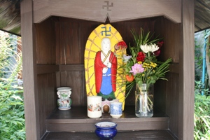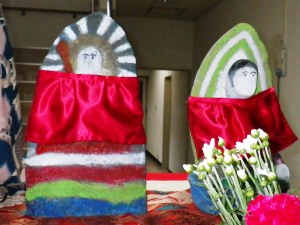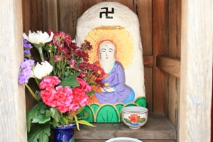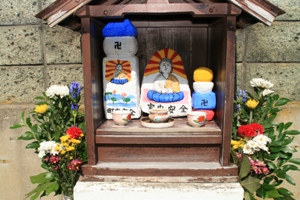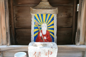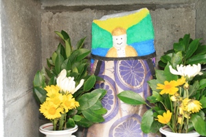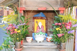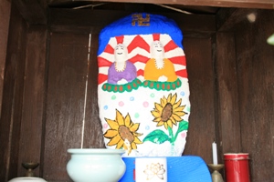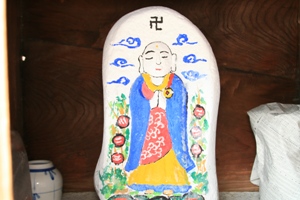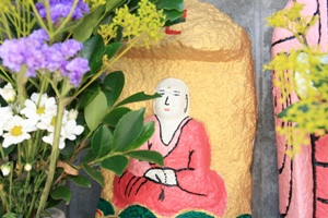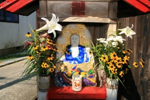 丹後の地蔵盆は他の地域と少し違った特色があるようです。それは、お地蔵さんを綺麗に洗って新しい前掛けをするだけではなく、石像本体をカラフルな色で塗り化粧をする事が他では見られない珍しい事のようです。地域によって多少異なりますが、子供に全てを任せている地区では顔面が真っ青の地藏さんもあるようです。(ーー;)