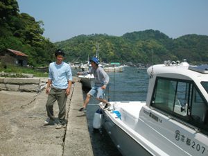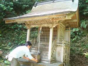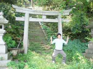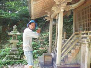 まずは祟(タタリ)が無いように浦嶋神社でお参りをした。偶然、神子さんが出て来たので「龍穴」の場所を聞くと、あの山のふもとだと指をさした。 |