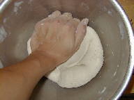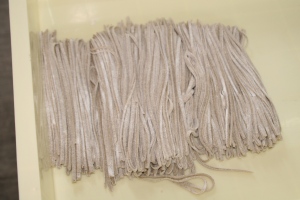 | 出来上がった麺を、沸騰させたたっぷりの湯にパラパラとほぐしながら入れます |
