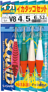 100m以深の釣りですから、当然タックルは深場仕様になりますが、ここ丹後の冬釣りでは、イカが浅場に来ているので、普段アジ・真鯛釣り等で使用している長さ2〜3mで30号程度の竿で十分対応出来ます。道糸はナイロンでもPEでもどちらでも可ですが、ナイロンなら5号以上あった方がよいです。仕掛けは市販のプラ角や浮スッテを使いますが、水深が浅いので手返しよいように、枝3〜4本で長さ10cm、枝間80cm位に改良すると使いやすいです。