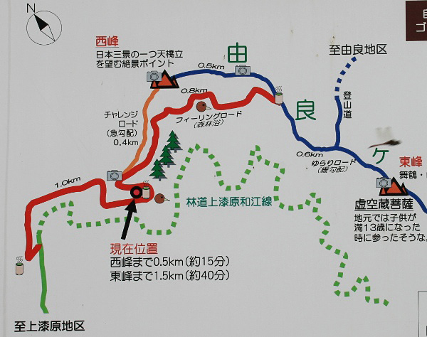 今回登ったのは、国道178号線から由良ヶ岳の裏側を通る、府道45号線に入り、上漆原地区にある白髭神社横を通る、林道上漆原和江線を走り、下図・赤太線の始点に車を止めて西峰へ登りました。始点から下図看板のあった「現在位置」地点までは約25分、そこから西峰までが約15分の合計約40分の山登りでした。