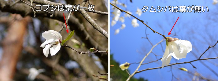コブシとニオイコブシ(タムシバ)の違いは、花のすぐ後ろに葉が一枚あるか無いかで見分ける事が出来ます。
