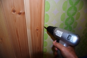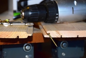 木が切れたら後は片側を溝にはめ込み順番に留めてゆくだけですが、ビスを打つ場所は下地骨材がある場所です。ベニアを剥がさずに作業する場合は、以前の釘跡や音で確かめ、骨材が何処に入っているかを調べ、印を付けておくと作業が楽です。