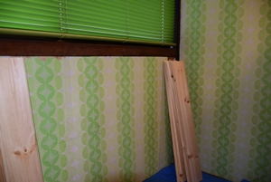 あと、羽目板の溝穴とその反対側の太さが合わず、入り難い場合があったので、事前に削って調整する必要がありました。また、素人作業なのでビスの留め方がマズク、そのビスの出っ張りに閊えて入り難い時は、そこだけ切込みを入れ調整しました。