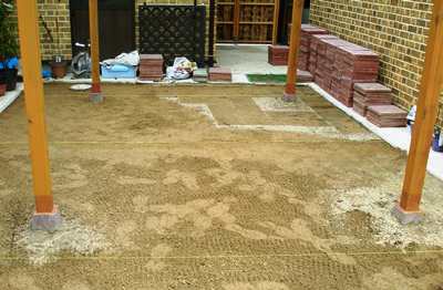 羽子板付き沓石(コンクリート基礎石)をホームセンターで購入し、レベルを測り所定の場所に設置し、柱を載せます。
