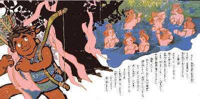 むかし、比治の里に三右衛門という狩人が住んでいました。ある日、三右衛門はいさなご山の頂きの池で水浴する八人の天女を見かけ、その羽衣の一つをかくしました。三右衛 門は羽衣をかくされた天女を連れて帰って妻とし三人の娘をもうけました。天女は農業や養蚕、機織り、酒づくりが上手で、この家はもとより比治の里はたいそう豊かになりました。しかし、天恋しさにたえかねた天女は、三右衛門の留守に娘からかくし場所を聞き出し、大黒柱の穴にあった羽衣を身につけると、外からかけ戻った三右衛門に「七日七日に会いましょう。」と再会を約して大空に舞い上がっていきました。
